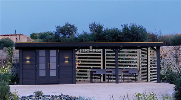 Het PS94 tuinhuis is een innovatief Pro systeem dat indruk maakt met zijn moderne look en verfijnde functionaliteit. Het huisje is verdeeld in twee ruimtes: Een gezellige kamer biedt ruimte voor verschillende doeleinden, terwijl het aangrenzende terras dient als ontspannende buitenruimte. Vier grote lamellenpanelen definiëren niet alleen het terras, maar laten ook de zon en een aangenaam briesje binnen. Robuuste, brede palen zorgen voor stabiliteit en duurzaamheid. De deur is voorzien van mat glas dat zorgt voor privacy, licht binnenlaat maar een vrij uitzicht verhindert. Dit is ideaal voor kamers waar een zekere ondoorzichtigheid gewenst is.