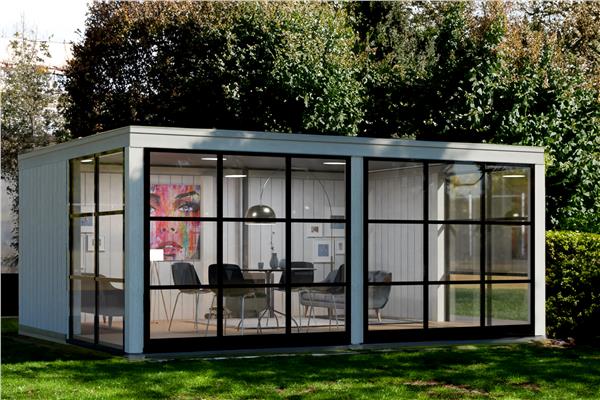 Het unieke PSM5 tuinhuis, gemaakt met het gelicenseerde Pro systeem van Lugarde, maakt indruk met zijn Scandinavische vurenhout met steigerhouten look. De steigerhouten look geeft het gebouw een rustieke charme, met zijn ruwe en lichtgrijze oppervlak dat doet denken aan de structuur van steigers. De voorkant is ontworpen als een goed doordachte tuinkamer en heeft elegante glazen schuifwanden in een trendy stalen look. De linker- en rechterkant zijn half gesloten met vaste glazen wanden in dezelfde stalen look, terwijl de achterwand van de tuinkamer gemaakt is van Scandinavisch vurenhout. Het ontwerp wordt afgerond door een plat dak met duurzame EPDM folie, wat het PSM5 tuinhuis een eigentijdse en stijlvolle afwerking geeft.