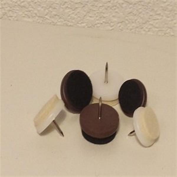 Een ronde viltglijder (4 mm dik) gelijmd op een kunststof voet van 5 mm dik (totale dikte: 9 mm). Bevestiging geschied met 1 spijker die reeds bevestigd is aan de meubelglijder. Ideaal voor meubelen met houten poten die op harde vloerbedekking staan. Verkrijgbaar in de maten (rond) 20, 24 en 28 mm in de kleuren wit en bruin. Inhoud: 20 stuks